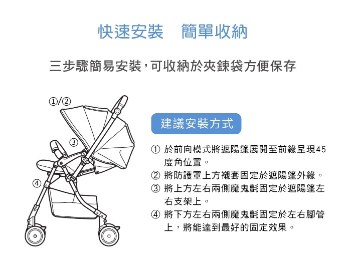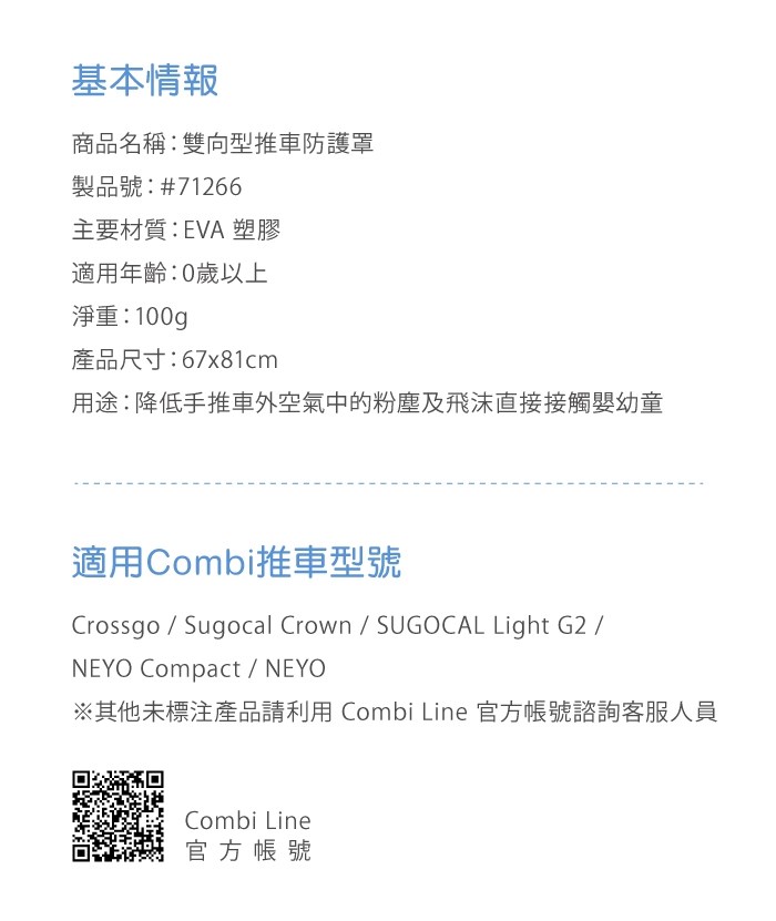 ※此產品非玩具,勿讓幼兒獨自接觸 ※此產品為手推車專用,請勿使用於其他產品 ※表面材質在使用後出現皺摺或壓痕為正常現象。 ※請勿接觸火源及其他熱源以避免危險