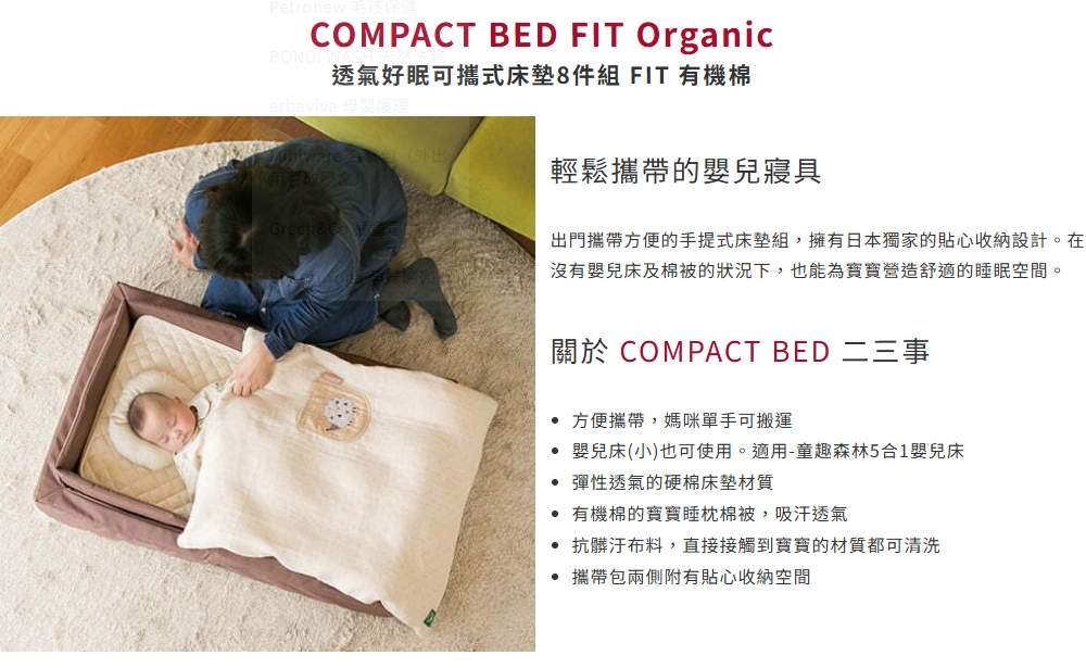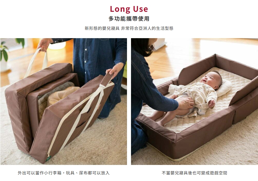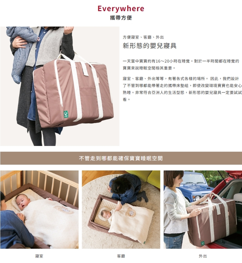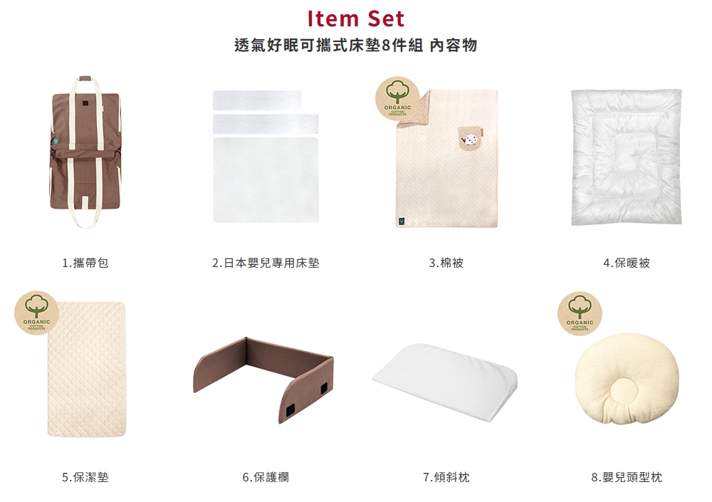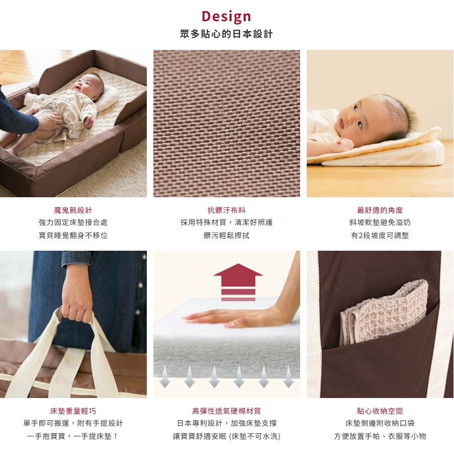 【產品內容物】攜帶包、日本嬰兒專用床墊、棉被、保暖被、保潔墊、保護欄、傾斜枕、嬰兒頭型枕