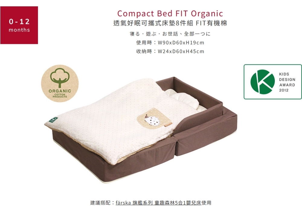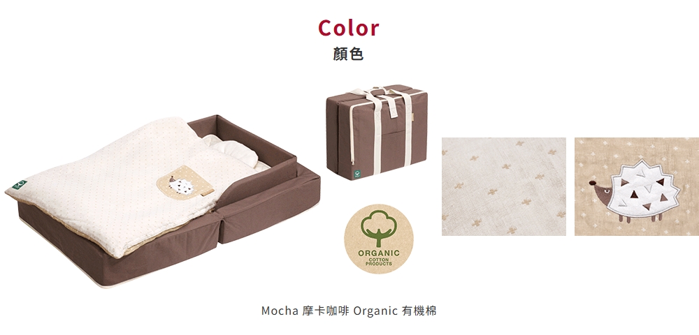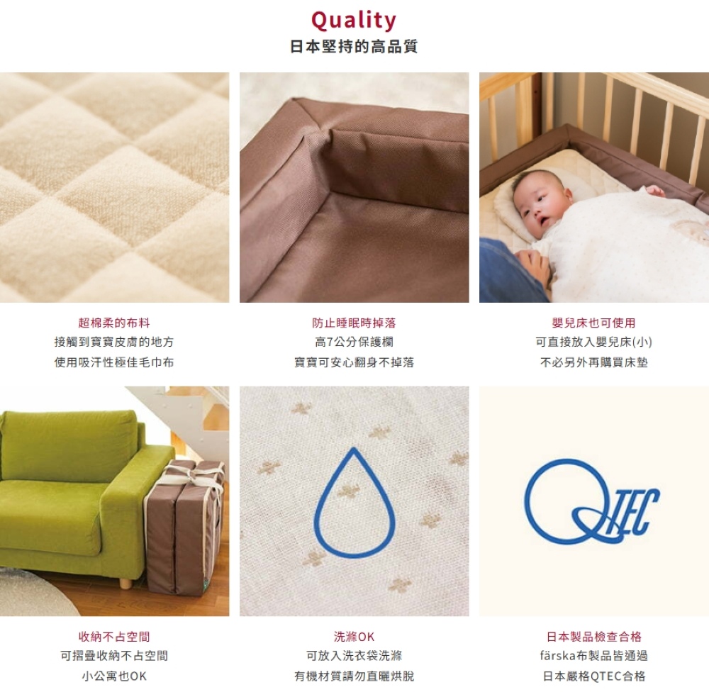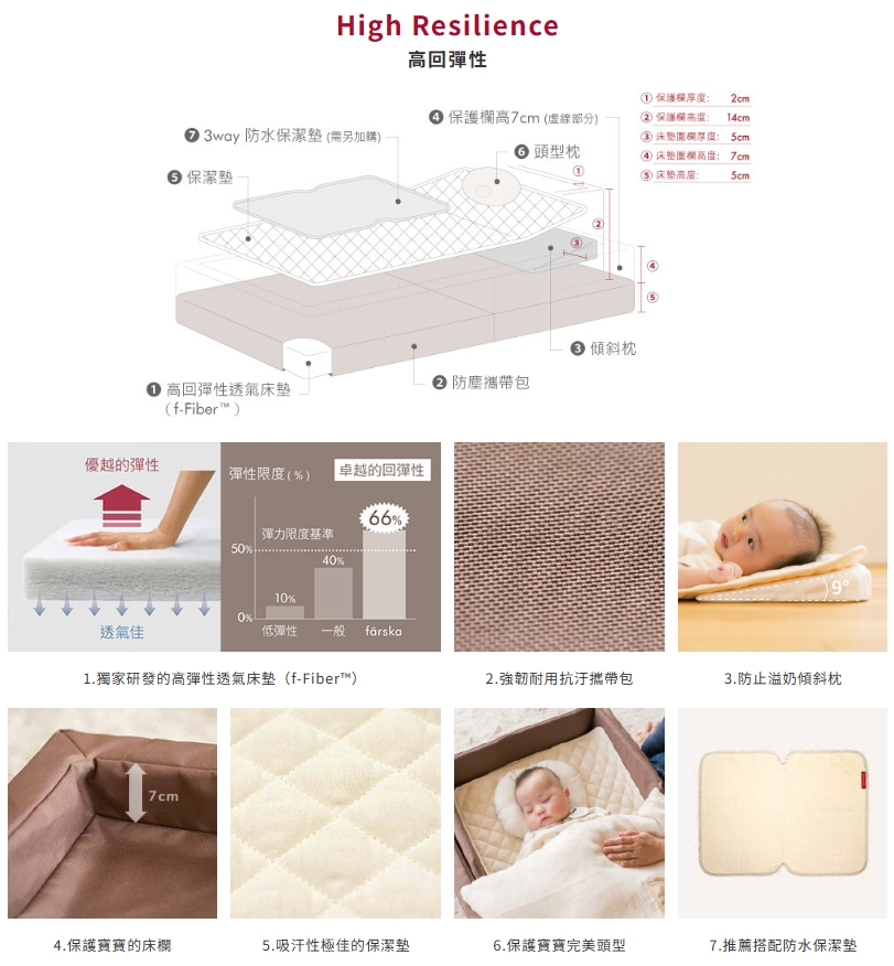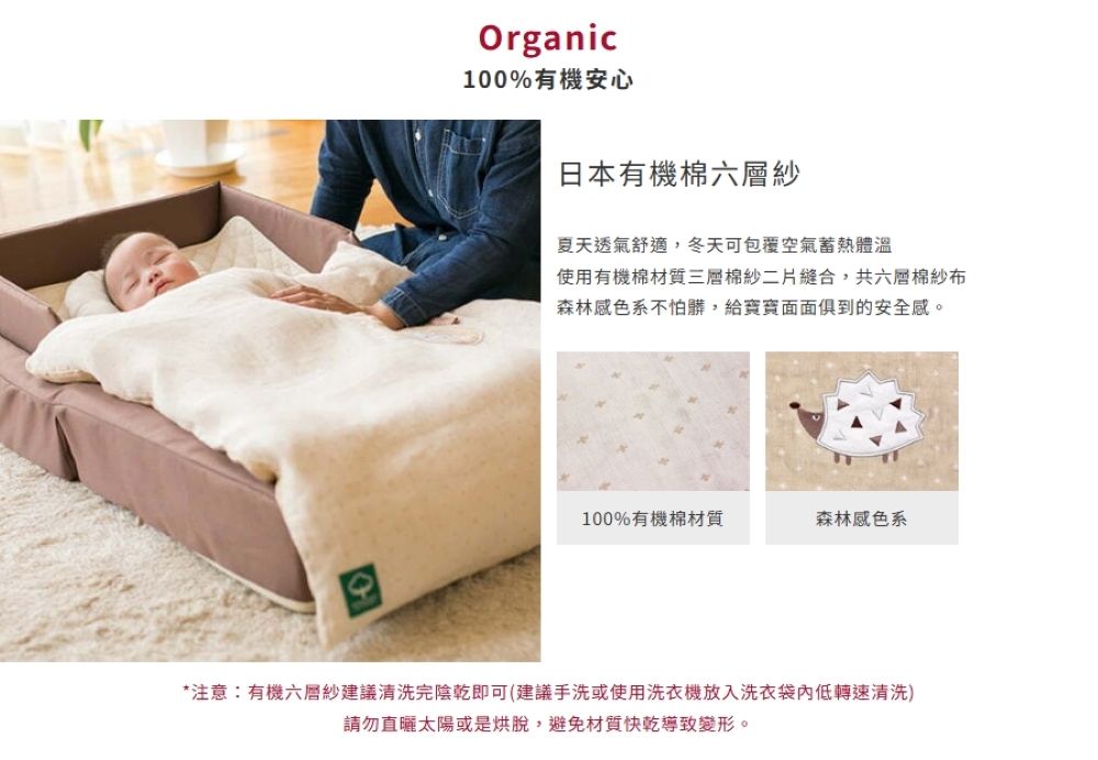 【產品內容物】攜帶包、日本嬰兒專用床墊、棉被、保暖被、保潔墊、保護欄、傾斜枕、嬰兒頭型枕